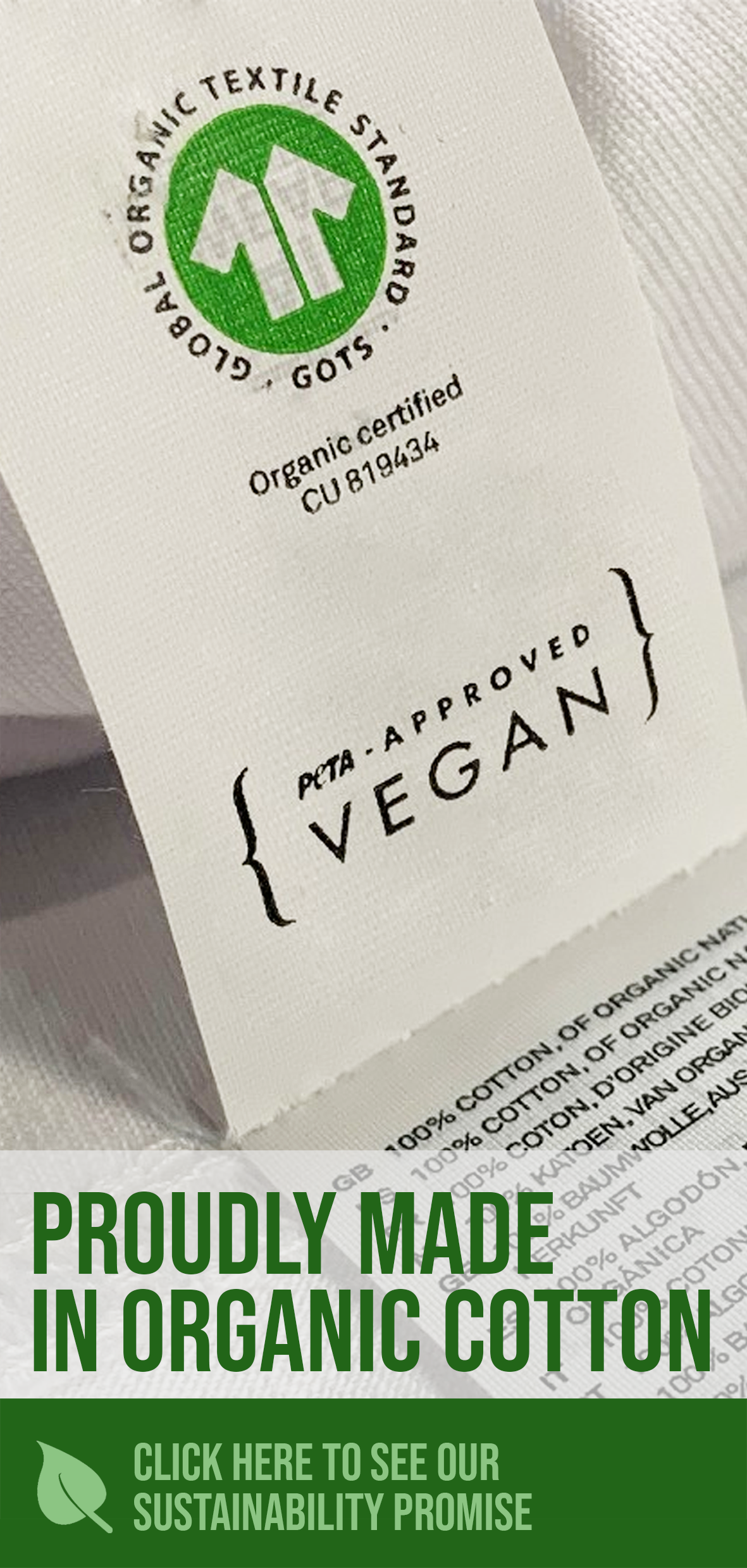 • Help the environment. All garments are 100% eco friendly from textile to ink with the cotton organic and the ink water based, packaging is recyclable making this a fully sustainable product.